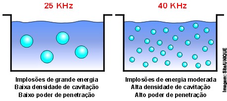 Frequências de 19, 20 ou 25 Khz são usadas para limpezas mais densas enquanto 37 e 40Khz são usadas para limpeza de equipamentos que possuem mais detalhes e maior dificuldade de limpeza manual.